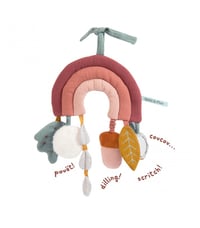 Muslin rainbow in natural colours, with tie fastenings. An element of nature is attached to each arc: a squeaky cloud, a rattly acorn and a mirror apple. Six pieces for little ones to grab, pull or shake to keep them entertained.