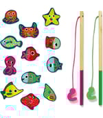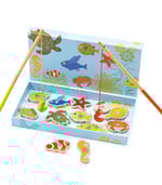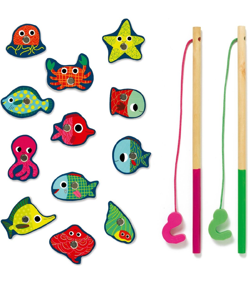 Encourage concentration, observation and fine motor skills for your little one with this colourful magnetic fishing set by Djeco! Includes 12 beautifully illustrated magnetic wooden fish, 2 fishing rods in a lovely box that is both the "pond" and provides easy storage.