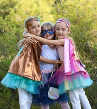 Waistbands are fabric wrapped for a nice finish & comfort (no scratching here). The emblems on the back of the capes are embroidered around the edges for a nice finish. The copper & teal cape has a large glitter star on the back of the cape, which is lined for a complete elegant finish. There are star and lightning bolt accents on the skirts with a small piece of round felt on the back to hold them securely to the tulle. The skirts have a peplum and two layers of tulle with a fantastic crinkle metallic bottom lining layer. The masks are double sided and have a lightning bolt feature to match the set perfectly.