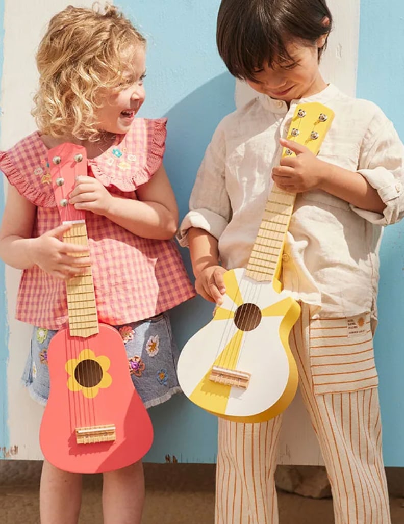 Why not let them create some music of their own? Your child can perform solo or team up with friends and family to put on a fun concert for Teddy or the whole crew. It's a great way to share the joy of music with everyone around.The strings on this wooden toy guitar can be strummed just like those on a real guitar so your child can explore musical sounds and rhythms.